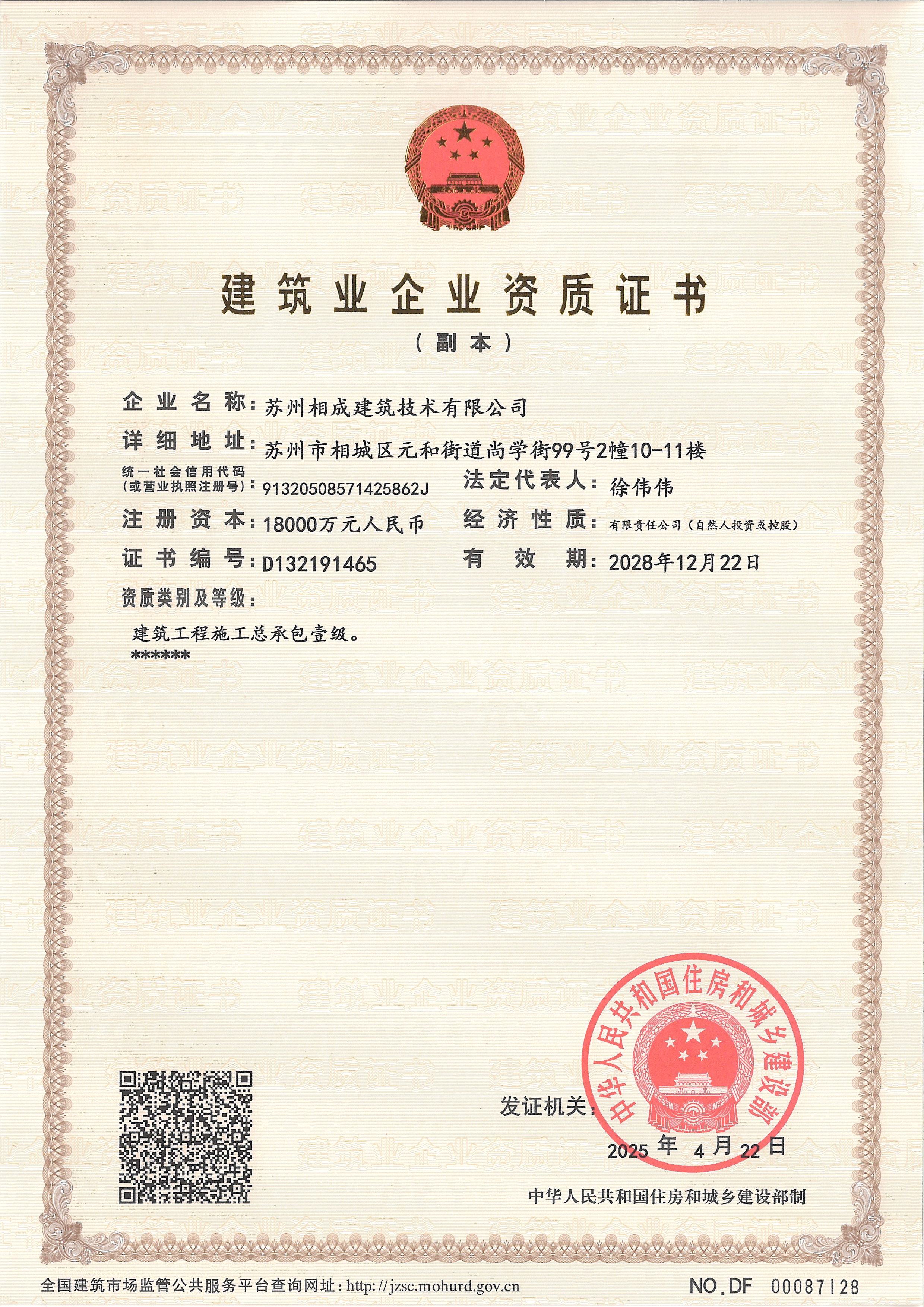 蘇州相成建筑技術有限公司是一家以提供建筑開發(fā)服務為主的建筑企業(yè),公司位于蘇州市相城區(qū),成立于2011年3月,注冊資本 10000萬,歷經13年的努力于2022年7月獲省住建廳頒發(fā)房屋建筑工程施工總承包壹級資質,市政公用、建筑裝飾、地基基礎、消防設施、鋼結構工程等專業(yè)承包二級資質; 2023 年6月份增設房屋建筑工程監(jiān)理甲級、市政一級監(jiān)理資質;目前是相城區(qū)唯一一家集施工總承包一級和建筑工程監(jiān)理甲級資質的企業(yè)。